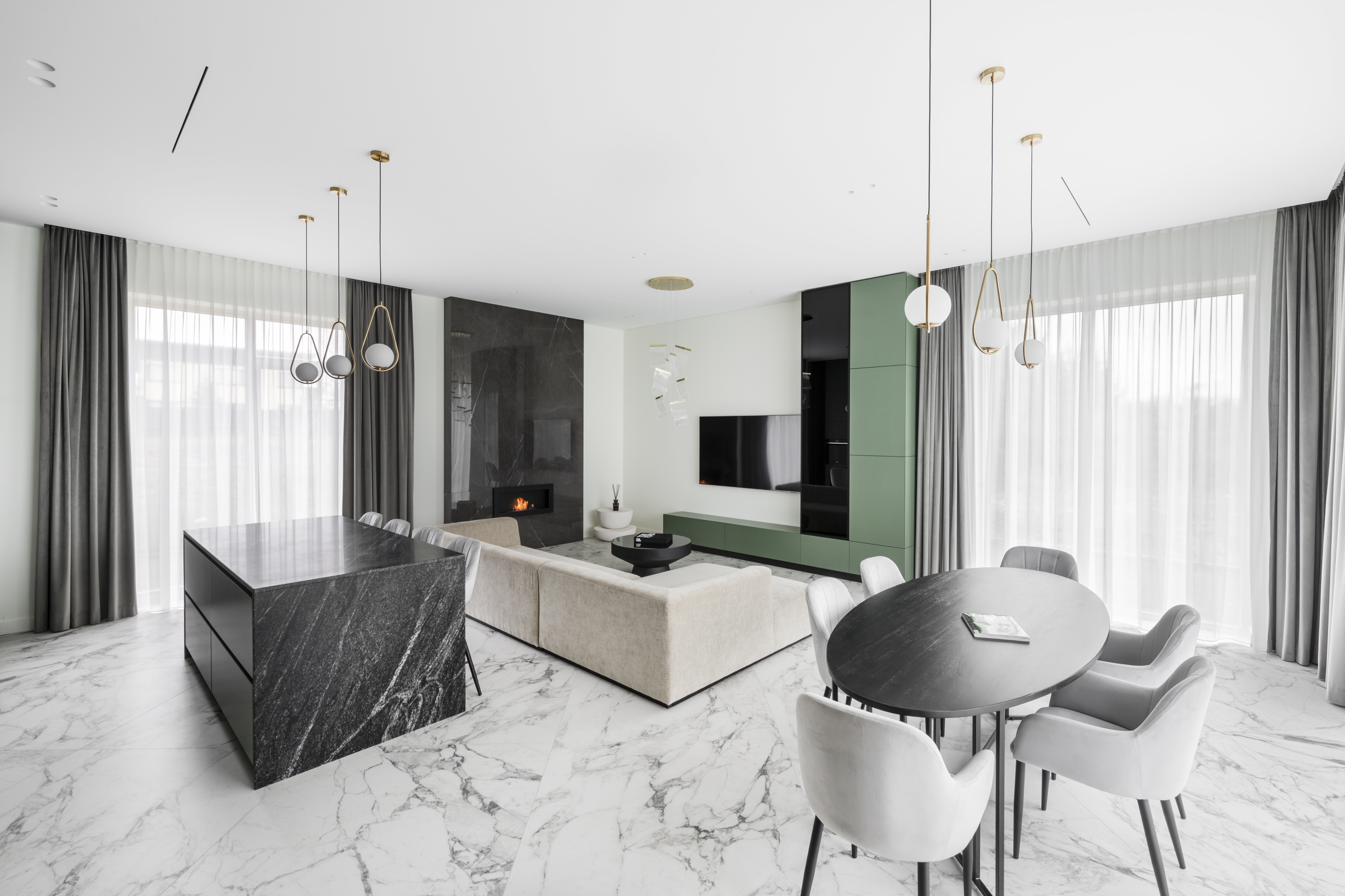 Užuolaidos svetainėje ir virtuvės dvigubos romanetės