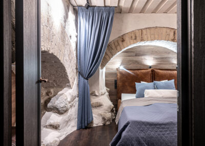 57. Mėlynos spalvos naktinės užuolaidos idealiai priderintos prie tapeto atspalvio puošia sodyba Trakuose